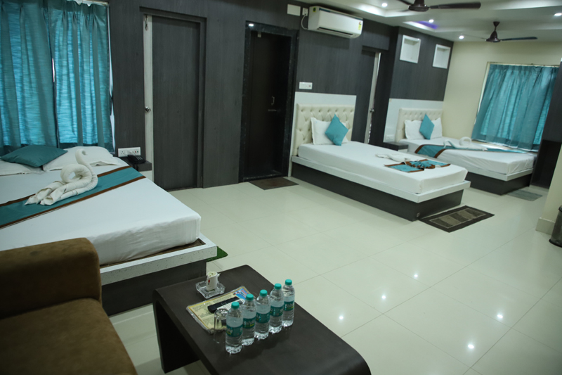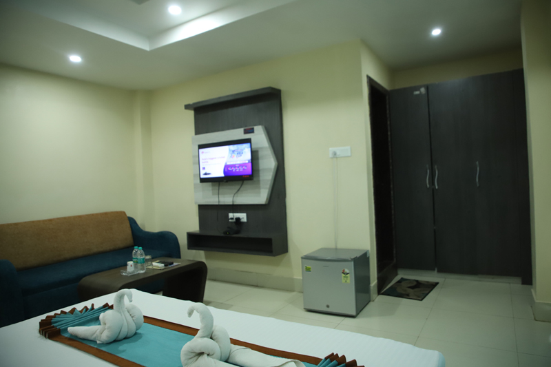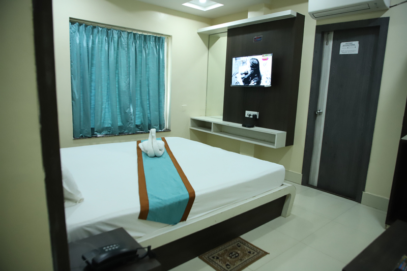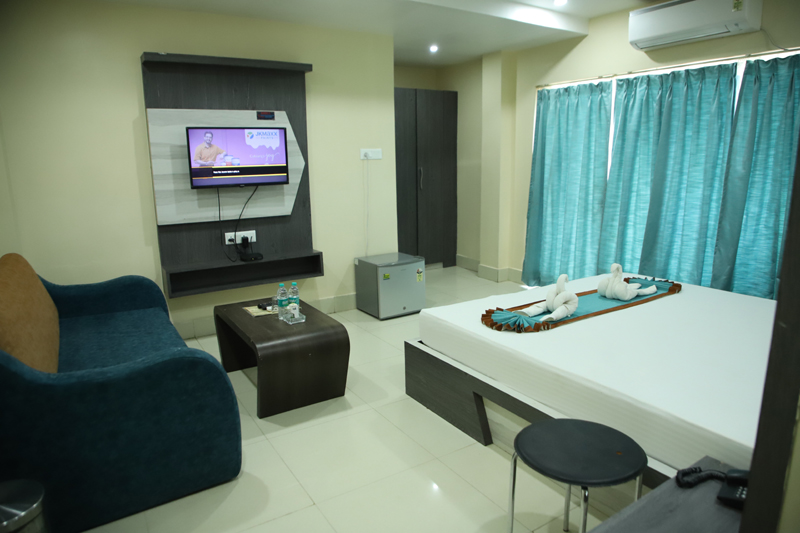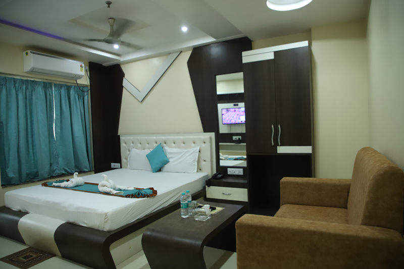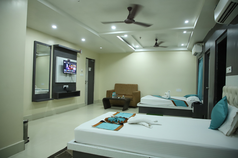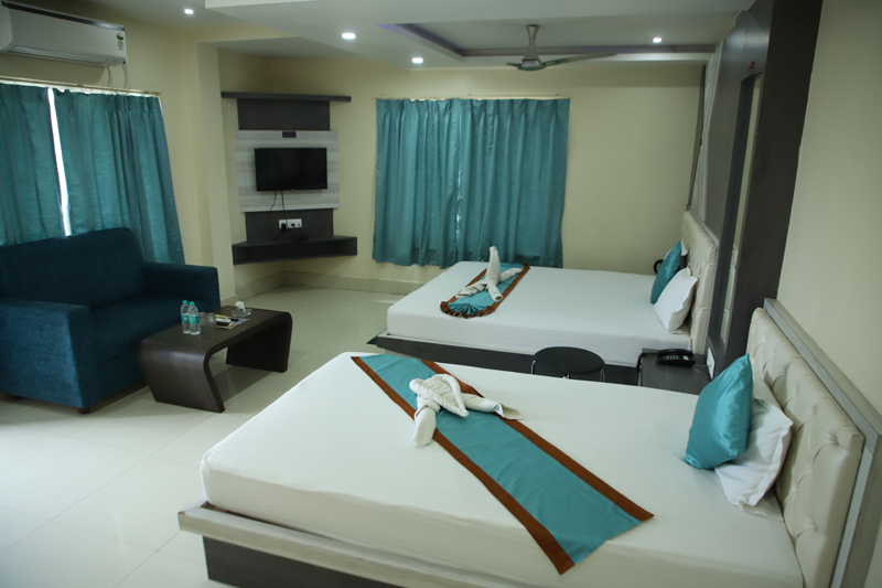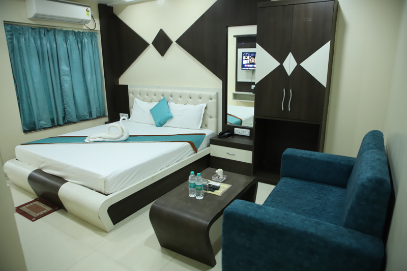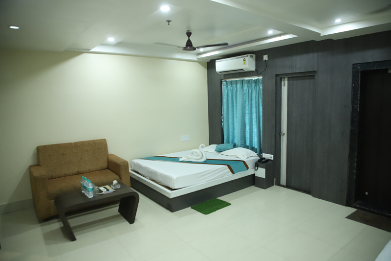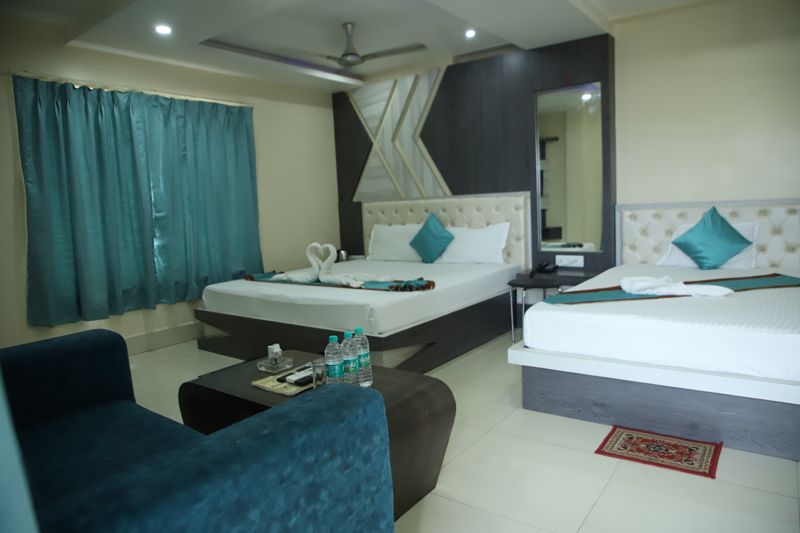 A spacious and well-appointed suite designed for two guests, featuring a comfortable queen-size bed and modern interiors. Guests can enjoy high-speed internet, access to a swimming pool, and convenient services such as 24/7 front-desk support, room service, and laundry. The property also offers quality dining, parking facilities, and secure luggage storage for a relaxed and hassle-free stay.